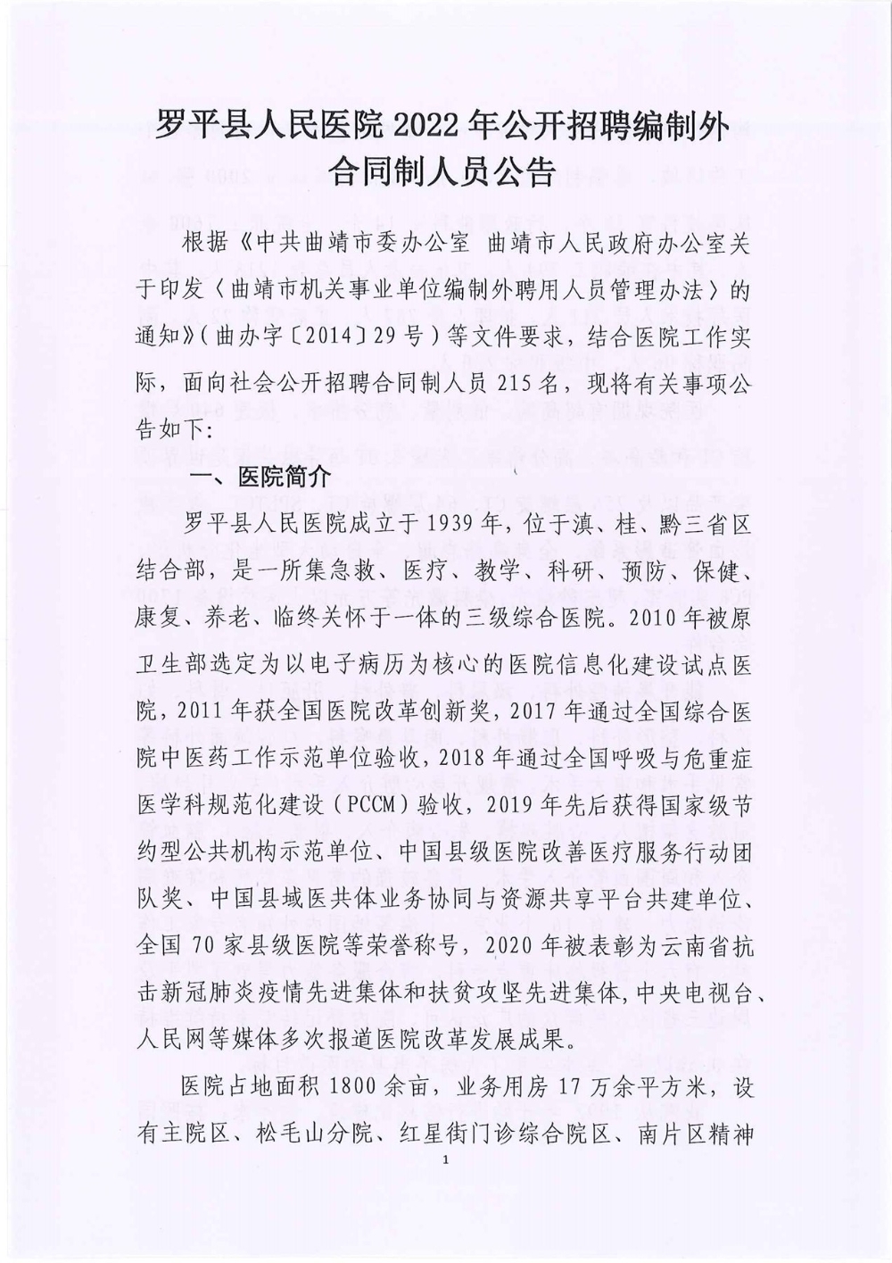 云南省曲靖市羅平縣人民醫(yī)院2022年招聘編制外合同制人員215名