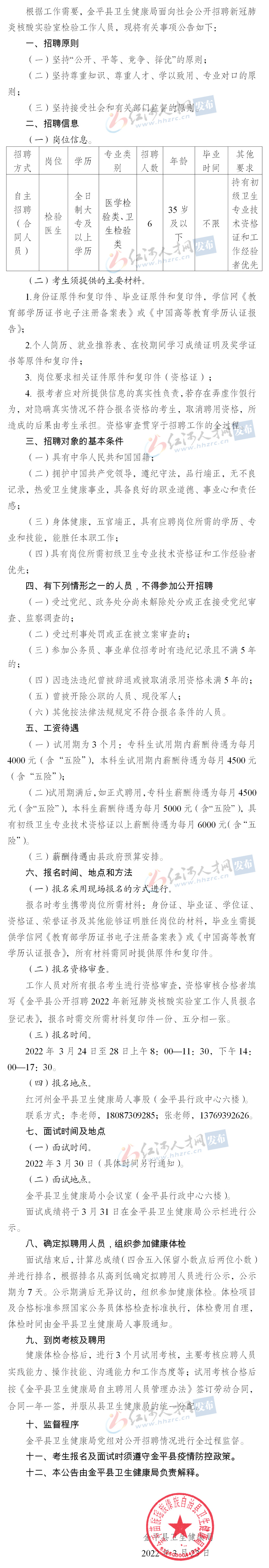 為滿足醫(yī)療衛(wèi)生事業(yè)發(fā)展需要,按照公開(kāi)、平等、競(jìng)爭(zhēng)、擇優(yōu)原則,“云南省紅河州金平縣衛(wèi)生健康局招聘新冠肺炎核酸實(shí)驗(yàn)室檢驗(yàn)工作人員6名”的公告正式發(fā)布啦!關(guān)注著醫(yī)療招聘的小伙伴,一定不要錯(cuò)過(guò)呀!事不宜遲,接下來(lái)就和小編一起來(lái)看看具體崗位和招聘相關(guān)事宜吧~