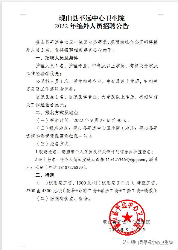 云南省文山州硯山縣平遠中心衛(wèi)生院2022年招聘編外人員3名