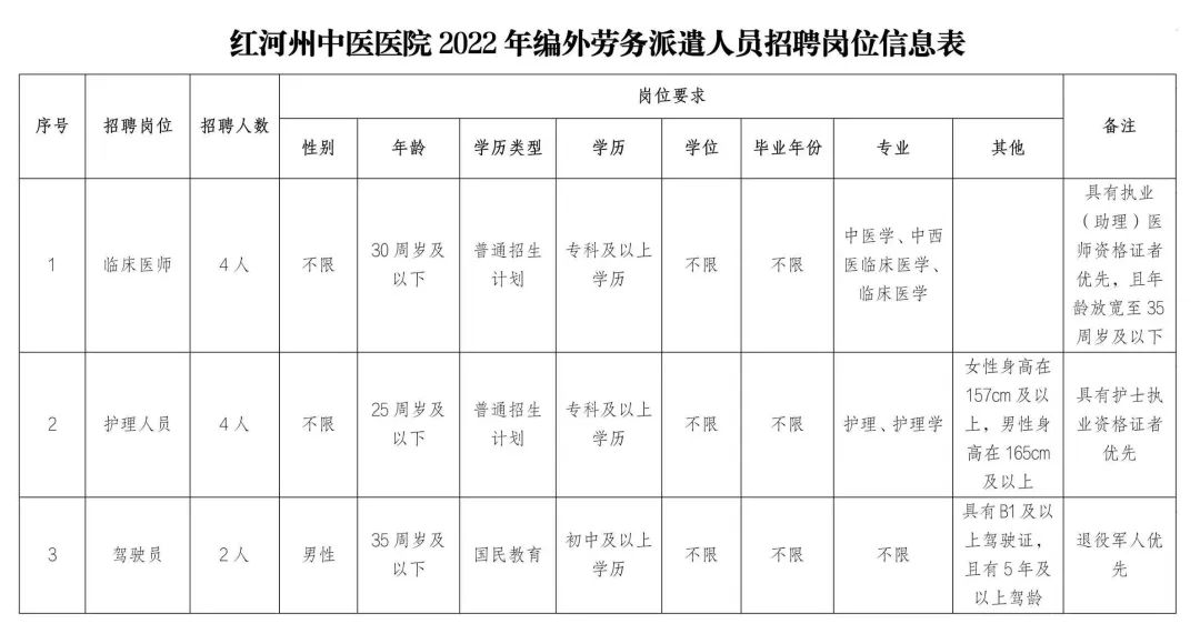 云南省紅河州中醫(yī)醫(yī)院2022年招聘編外勞務(wù)派遣人員10名