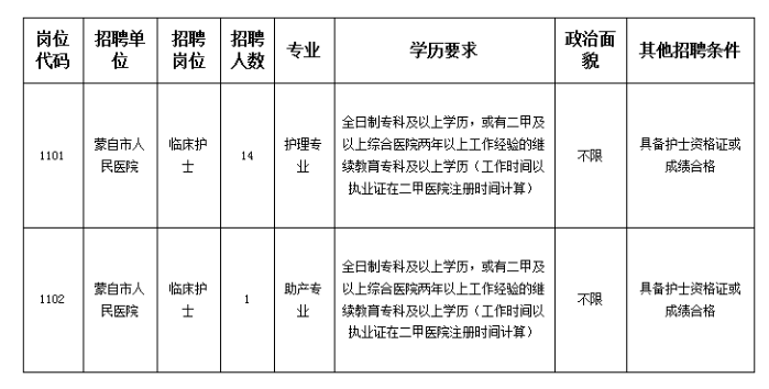 云南省紅河州蒙自市人民醫(yī)院2022年11月招聘合同制護(hù)理人員15名