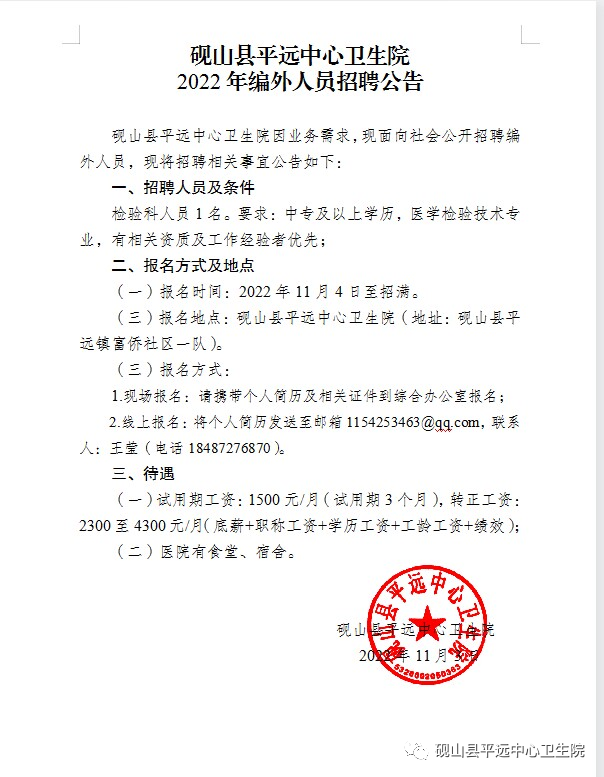 云南省文山州硯山縣平遠中心衛(wèi)生院2022年招聘編外檢驗科人員1名