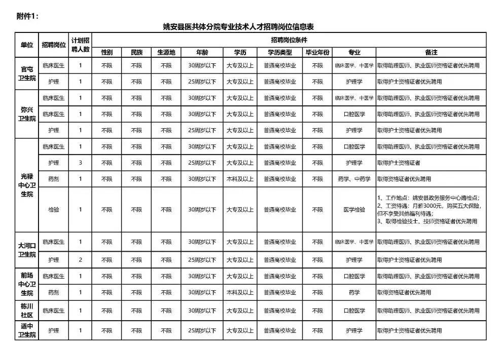 姚安縣醫(yī)共體各分院計劃招聘衛(wèi)生專業(yè)技術(shù)人才18名。具體詳見《姚安縣醫(yī)共體分院專業(yè)技術(shù)人才招聘崗位信息表》。
