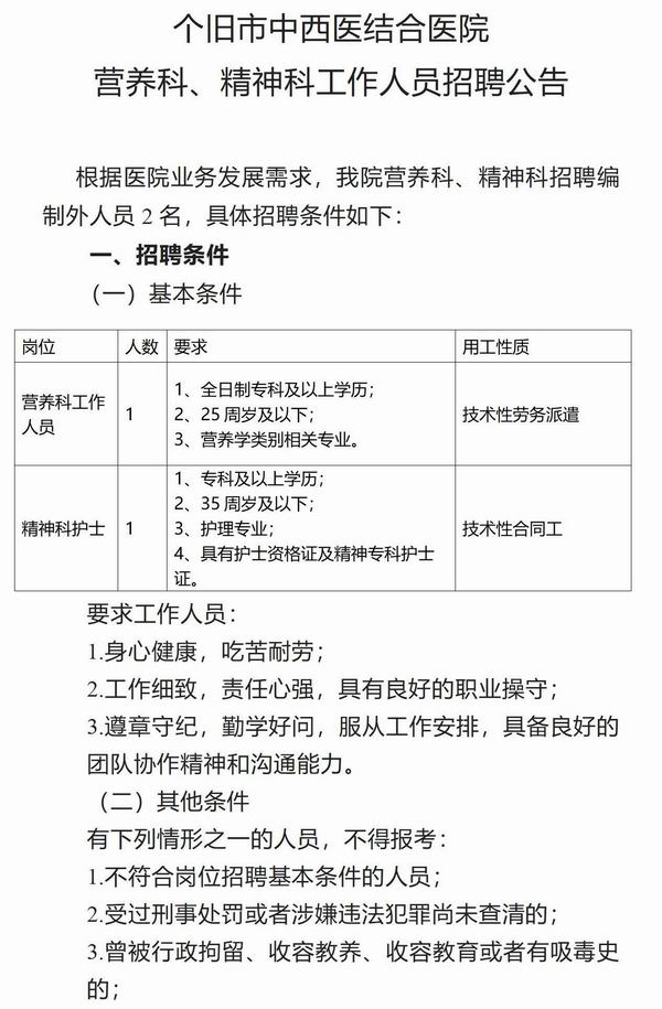 云南省個舊市中西醫(yī)結(jié)合醫(yī)院招聘營養(yǎng)科、精神科工作人員2名
