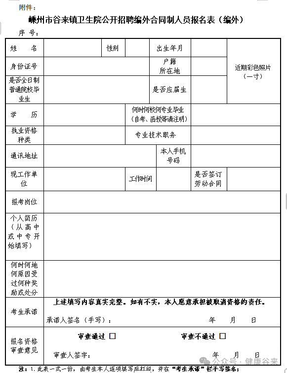 填寫好的《嵊州市谷來鎮(zhèn)衛(wèi)生院公開招聘編外合同制人員報名表》1份,同時提供身份證、畢業(yè)證書、學位證書(本科及以上需提供)、教育部學歷證書電子注冊備案表及其他報考職位所需證件的原件及復印件。(網(wǎng)址:http://www.chsi.com.cn)在線生成的《教育部學歷證書電子注冊備案表》。