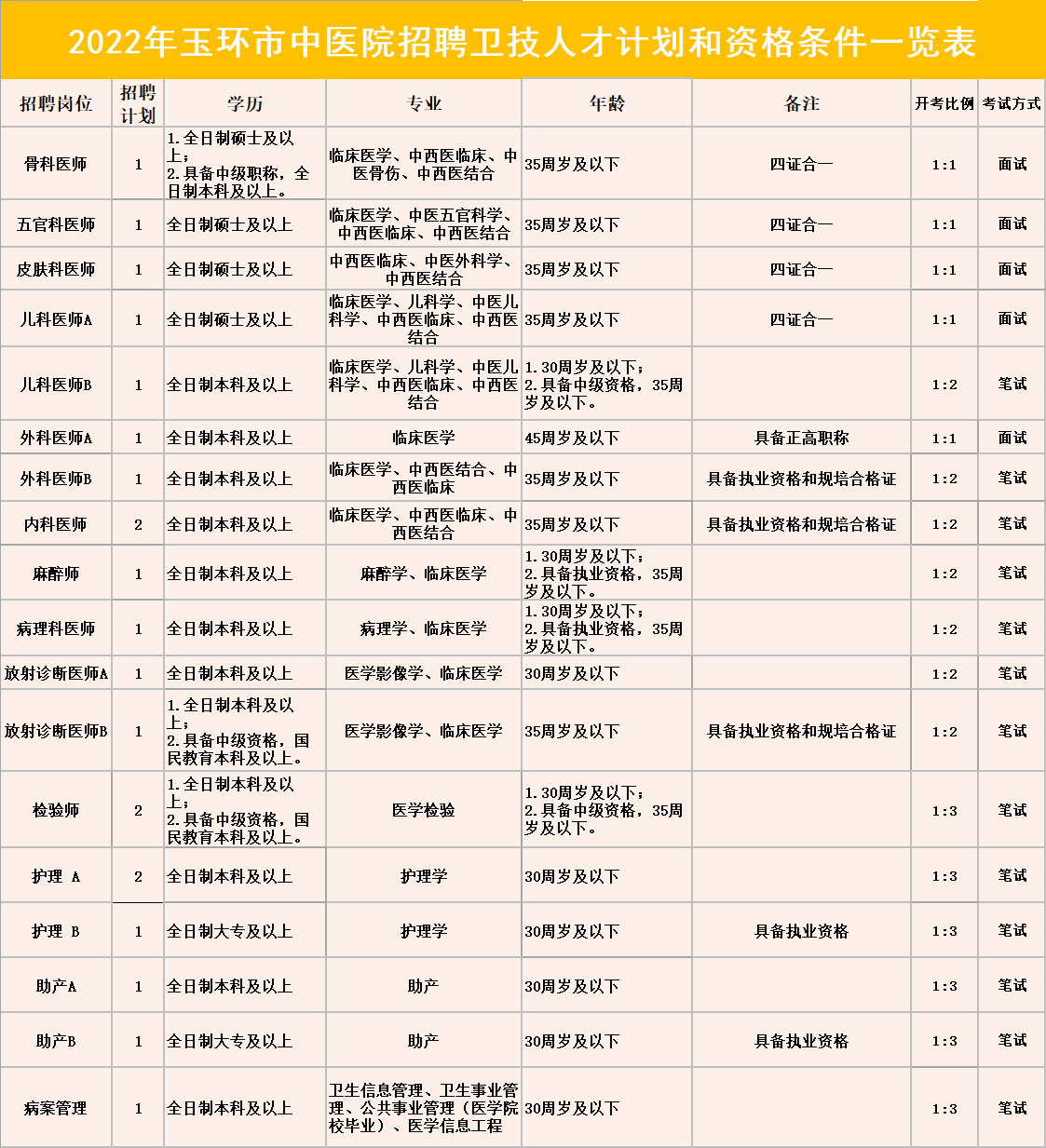 考核方式具體詳見《2022年玉環(huán)市衛(wèi)生健康系統(tǒng)招聘衛(wèi)技人才計劃和資格條件一覽表》,按計劃表中的比例開考??荚嚂r間暫定為4月16日,具體詳見準(zhǔn)考證。