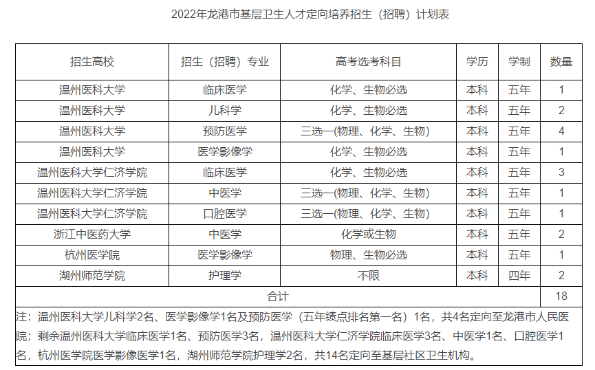 浙江省溫州市龍港市2022年基層衛(wèi)生人才定向培養(yǎng)招生(招聘)18名