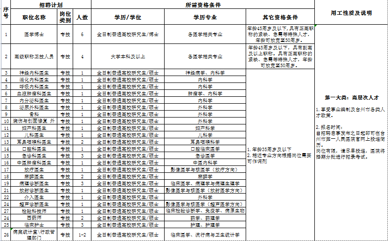 另:所學(xué)專業(yè)符合《臺州市衛(wèi)生緊缺人才目錄》,經(jīng)評定為緊缺人才的可按政策享受相應(yīng)人才政策。