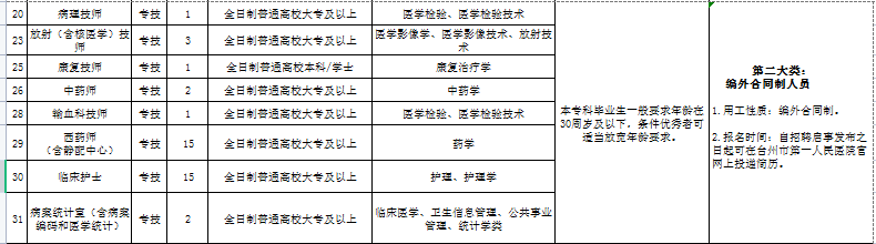 (二)通過市人社局及衛(wèi)健委公考入編的崗位計劃未在上述招聘計劃范圍內(nèi),醫(yī)學(xué)類專業(yè)本科學(xué)歷人員、非醫(yī)學(xué)類專業(yè)本科及以上學(xué)歷人員請關(guān)注市人社局、市衛(wèi)健委的公開招聘公告,具體的崗位人數(shù)、資格條件及報名考試時間以上級主管部門發(fā)布的公告為準(zhǔn)。