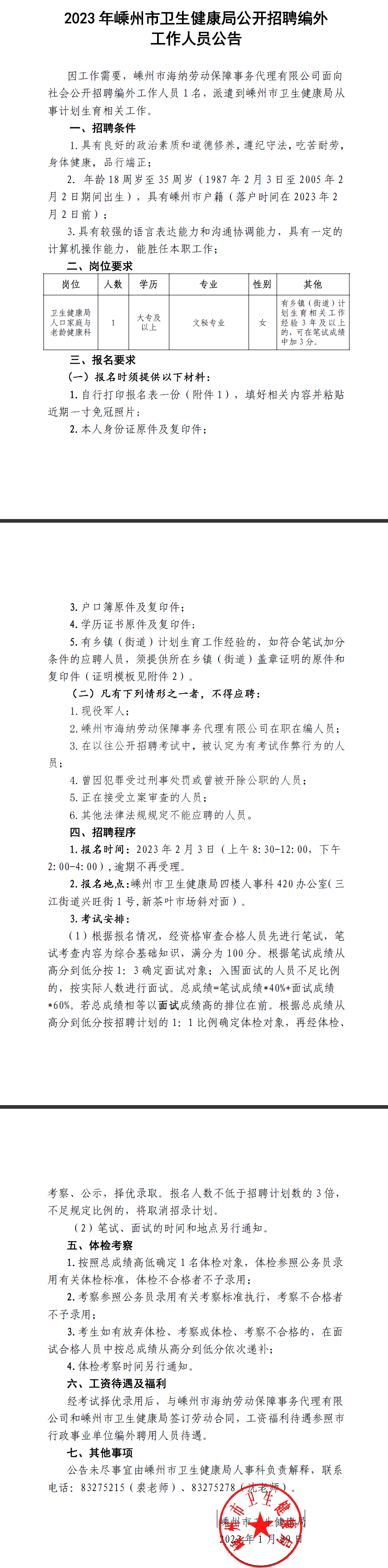 浙江省紹興市嵊州市衛(wèi)生健康局2023年招聘編外工作人員1名