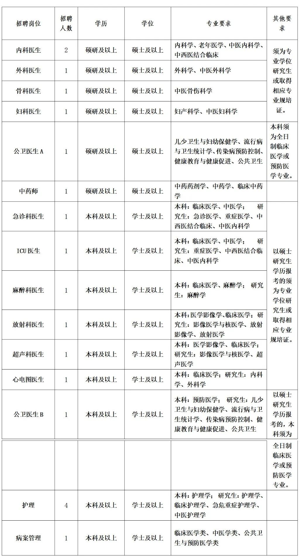 (二)招聘條件1.具有中華人民共和國(guó)國(guó)籍,遵守中華人民共和國(guó)法律、法規(guī);2.自愿履行醫(yī)療衛(wèi)生崗位工作人員崗位職責(zé),遵守紀(jì)律,品行端正;3.具備招考崗位所需的專(zhuān)業(yè)、學(xué)歷、學(xué)位要求;4.身體健康。年齡35周歲(1987年2月20日以后出生)以下;具有博士研究生學(xué)歷(學(xué)位)人員,年齡可放寬到45周歲(1977年2月20日以后出生)以下;5.除崗位有特殊要求的以外,生源地和戶(hù)籍不限;6.招聘崗位要求的專(zhuān)業(yè)技術(shù)職務(wù)任職資格或職業(yè)資格等證書(shū)(以發(fā)文或發(fā)證時(shí)間為準(zhǔn))須在報(bào)名開(kāi)始日期前取得;7.符合招聘崗位需要的其他條件。