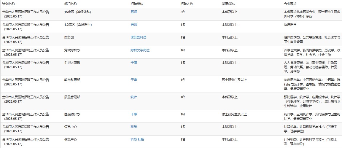 浙江省金華市人民醫(yī)院2023年5月招聘編制外工作人員12名