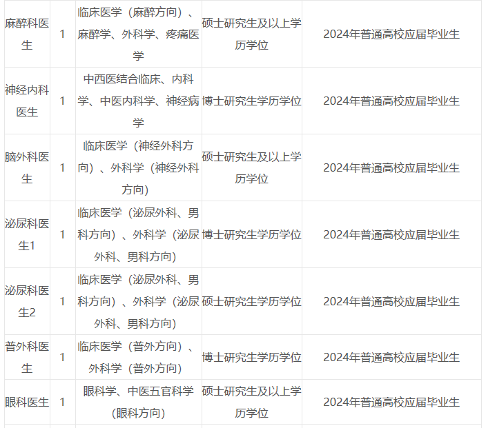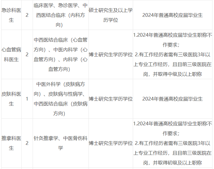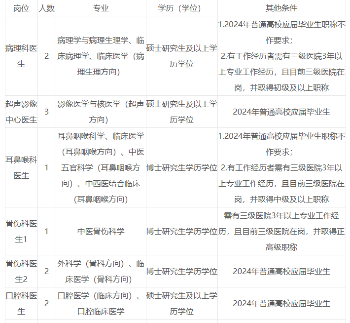 2、超聲科醫(yī)生崗位、急診科醫(yī)生(含急救醫(yī)生)崗位、重癥醫(yī)學(xué)科醫(yī)生崗位、病理科醫(yī)生(含技術(shù))崗位、兒科醫(yī)生崗位、麻醉科醫(yī)生崗位、婦產(chǎn)科醫(yī)生崗位、放射科醫(yī)生崗位、心電(腦電、肌電)圖醫(yī)生崗位、全科醫(yī)生崗位等緊缺專業(yè)崗位,具有中級職稱者,年齡在40周歲以下(具體要求以杭州市人力資源和社會保障局官網(wǎng)公告為準)。
