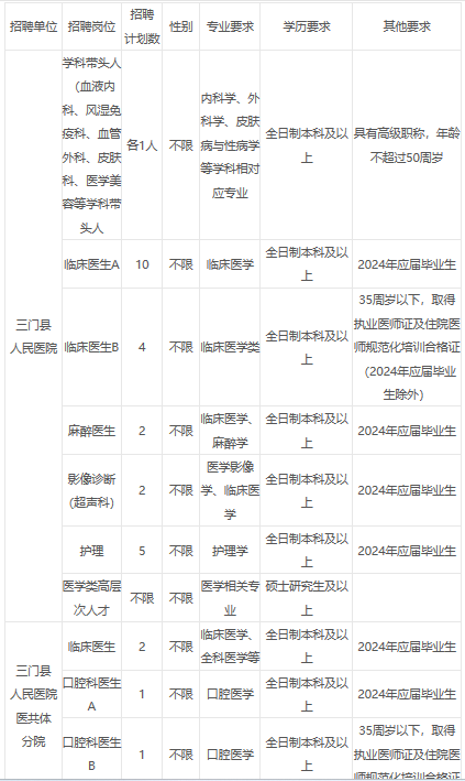 因三門縣醫(yī)療衛(wèi)生事業(yè)發(fā)展需要,經(jīng)研究,擬招聘高層次人才及2024屆醫(yī)學(xué)類高校畢業(yè)生若干名,現(xiàn)將有關(guān)事項公告如下: