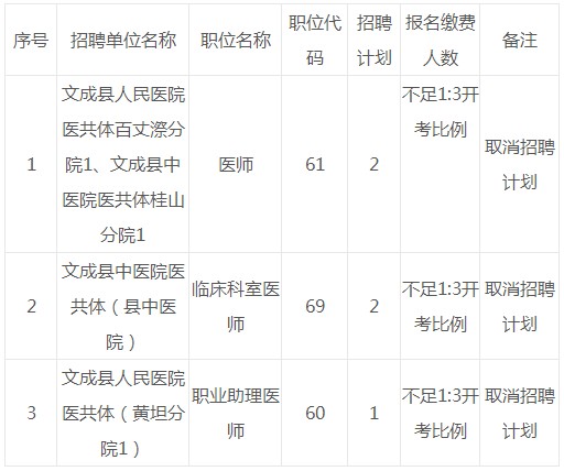 根據(jù)《2021年文成縣事業(yè)單位面向社會(huì)公開招聘工作人員公告》精神,本次招聘已完成網(wǎng)絡(luò)報(bào)名、資格初審等工作,以下報(bào)名繳費(fèi)人數(shù)不足開考比例(1:3)的職位取消招聘計(jì)劃,具體公布如下: