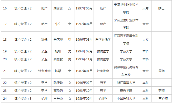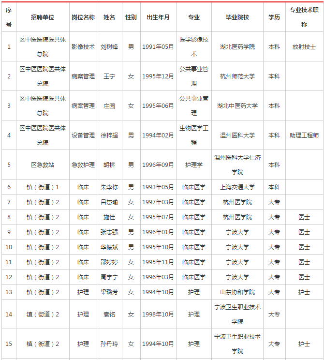 根據(jù)《2019年寧波市奉化區(qū)醫(yī)療衛(wèi)生單位公開招聘公告》,經(jīng)考試、體檢、考察等程序,現(xiàn)擬聘用劉樹鋒等24名同志為寧波市奉化區(qū)醫(yī)療衛(wèi)生單位事業(yè)編制工作人員,擬聘人員基本情況公示如下: