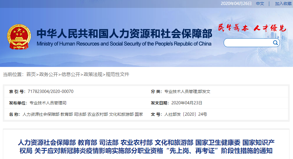 一、公告內容:對護士執(zhí)業(yè)資格、漁業(yè)船員資格、執(zhí)業(yè)獸醫(yī)資格、演出經紀人員資格、專利代理師資格等5項準入類職業(yè)資格實施“先上崗、再考證”階段性措施,凡符合該5項職業(yè)資格考試報名條件的高校畢業(yè)生,可以先上崗從事相關工作,再參加考試并取得職業(yè)資格。用人單位在2020年12月31日前招聘高校畢業(yè)生的,不得將取得上述職業(yè)資格作為限制性條件。