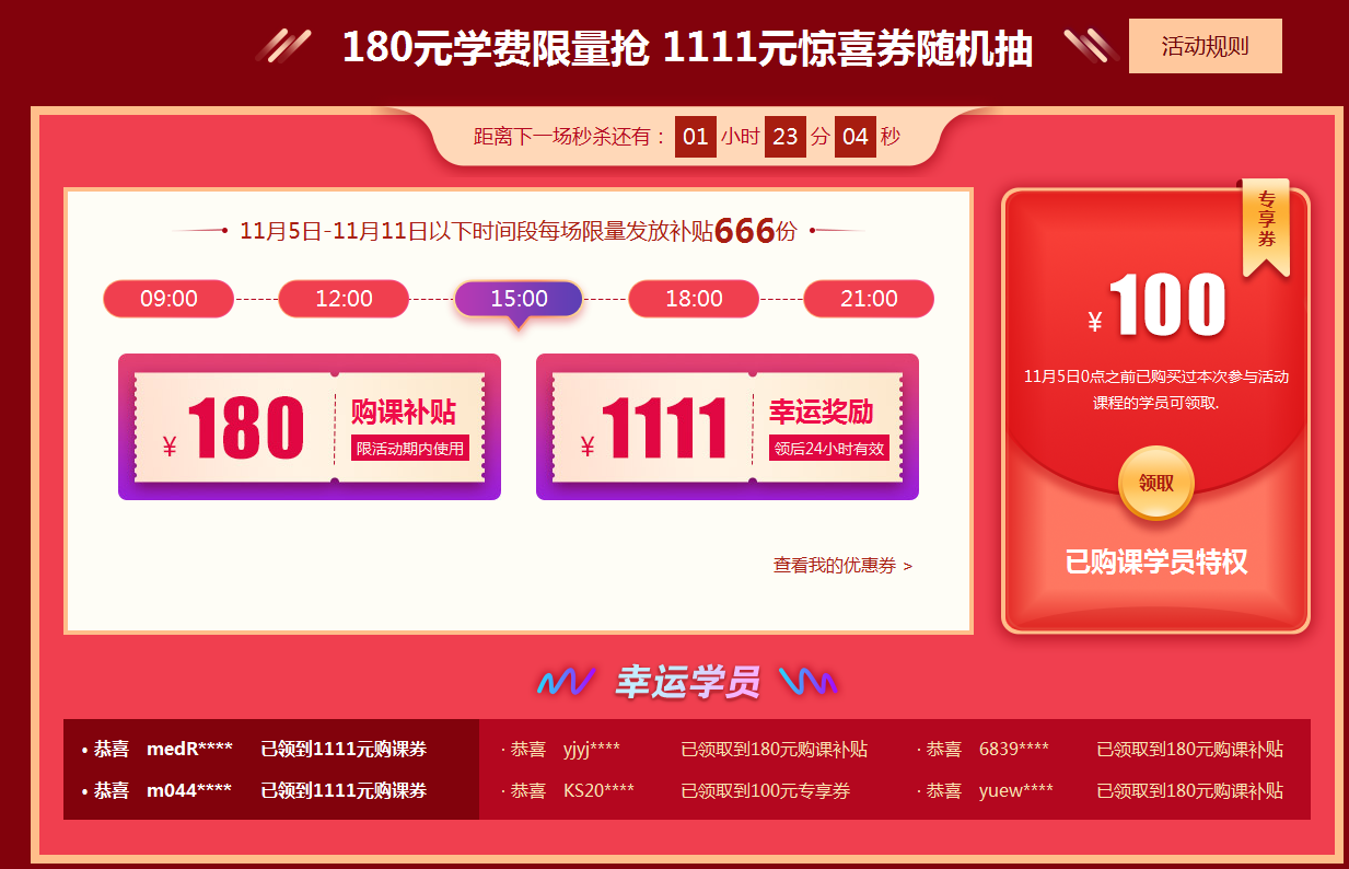 付定金說明:11月5日00:00-11月9日23:59點擊活動頁面"預(yù)付定金"付定金,11月10日00:00-11月11日23:59支付尾款,可享8折購課優(yōu)惠。