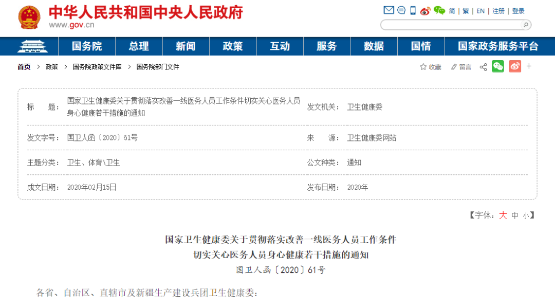 2020年,國務(wù)院辦公廳轉(zhuǎn)發(fā)了《國家衛(wèi)生健康委?人力資源社會保障部?財(cái)政部關(guān)于改善一線醫(yī)務(wù)人員工作條件切實(shí)關(guān)心醫(yī)務(wù)人員身心健康的若干措施》(國辦發(fā)〔2020〕4號),提出從七個(gè)方面完善措施,切實(shí)保障醫(yī)務(wù)人員權(quán)益。各地衛(wèi)生健康委要按照黨中央、國務(wù)院決策部署,認(rèn)真貫徹落實(shí)各項(xiàng)措施,協(xié)調(diào)相關(guān)部門,全力做好各項(xiàng)工作,切實(shí)改善一線醫(yī)務(wù)人員工作條件,關(guān)心醫(yī)務(wù)人員身心健康。原文如下: