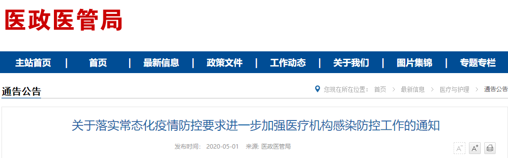 5月1日,為貫徹落實(shí)常態(tài)化疫情防控工作中“外防輸入、內(nèi)防反彈”的工作要求,進(jìn)一步強(qiáng)化醫(yī)療機(jī)構(gòu)感染防控的各項(xiàng)措施,最大限度降低院內(nèi)感染發(fā)生風(fēng)險(xiǎn),鞏固來(lái)之不易的防控成果,醫(yī)政醫(yī)管局發(fā)布公告《關(guān)于落實(shí)常態(tài)化疫情防控要求進(jìn)一步加強(qiáng)醫(yī)療機(jī)構(gòu)感染防控工作的通知》,通知指出: