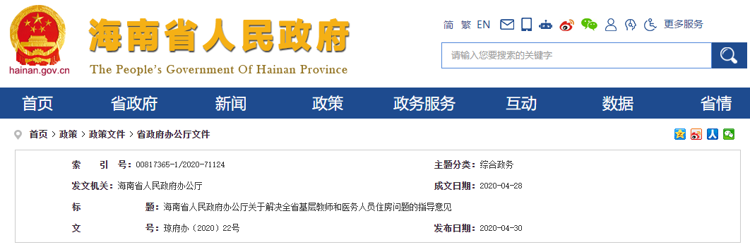 近日,海南省人民政府發(fā)布《海南省人民政府辦公廳關(guān)于解決全省基層教師和醫(yī)務(wù)人員住房問(wèn)題的指導(dǎo)意見(jiàn)》,通過(guò)建設(shè)安居型商品住房的方式,利用三年左右時(shí)間基本解決全省基層教師和醫(yī)務(wù)人員住房問(wèn)題。內(nèi)容如下: