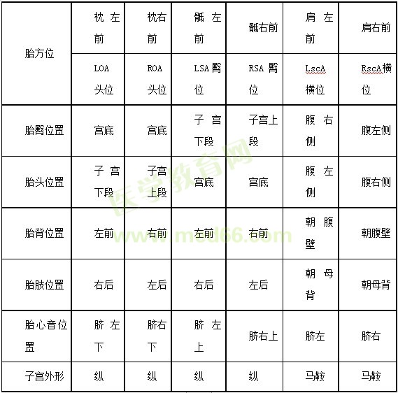 胎位為先露部的指示點(diǎn)和母體骨盆的關(guān)系,即在骨盆的四相位——左前、右前、左后、右后。通過矢狀縫和大小囟門來確定胎位。枕先露的指示點(diǎn)為枕骨(O);臀先露為骶骨(S);面先露為頦骨(M);肩先露為肩胛骨(Sc)。
