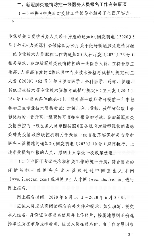 淄博關(guān)于延期舉行2020年衛(wèi)生資格考試及新冠肺炎疫情防控一線醫(yī)務(wù)人員報(bào)名工作有關(guān)問題的通知