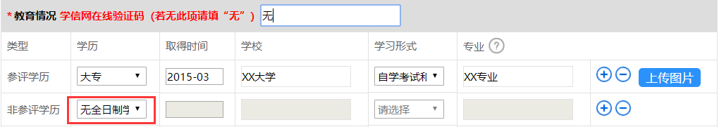 1、第一行是參評學歷,請?zhí)顚懣梢哉J可的最高學歷(學位同理),如果參評學歷為非全日制學歷,需要再填寫一行非參評學歷的信息,以補充一條全日制學歷信息,如無全日制學歷,則在非參評學歷一行的學歷下拉框,選擇“無全日制學歷”,選完后無須再上傳圖片;