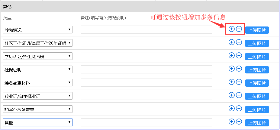 若需要其他補充資料時,在填報頁面最下方“其他”欄目選擇相應的類別,并上傳相關圖片資料,具體類別如圖: