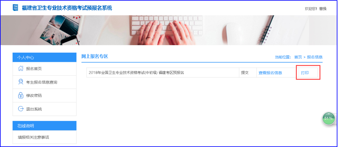 當提交審核,報名點通過后,考生方可點擊“考生報名信息查詢”進行打印,如下圖: