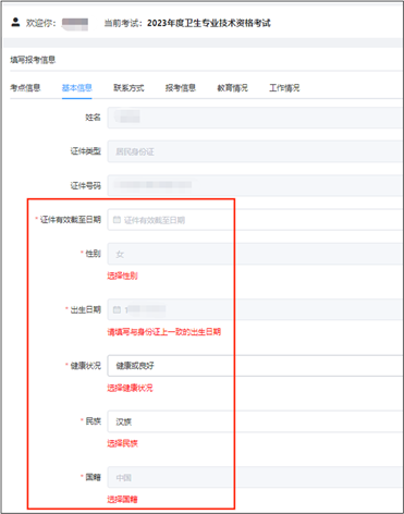 (2)基本信息會根據(jù)考生注冊時填寫的信息自動判斷引用,性別、出生日期如未引用,考生可手動選擇,民族和健康狀態(tài)請根據(jù)實際情況下拉選擇。