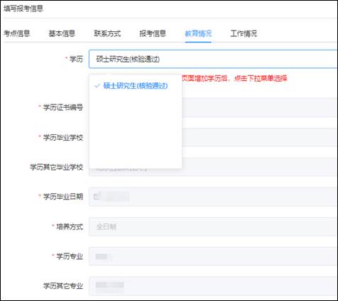 (5)學(xué)歷和學(xué)位相關(guān)信息下拉選擇,引用基本信息中【學(xué)歷學(xué)位信息維護】的內(nèi)容。如需修改,請退出當前考試項目,在【學(xué)歷學(xué)位信息維護】中進行新增,再次進入考試項目后,引用正確的學(xué)歷和學(xué)位信息。