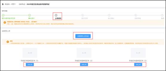 (8)確認照片后,采用線上確認的考區(qū),系統(tǒng)將跳轉(zhuǎn)至【上傳材料】頁,也可點擊【報考流程】中的“上傳材料”節(jié)點,進入上傳材料頁面,請考生按照考區(qū)的要求上傳相關(guān)證明材料,材料上傳完成后,點擊“提交報名信息”。