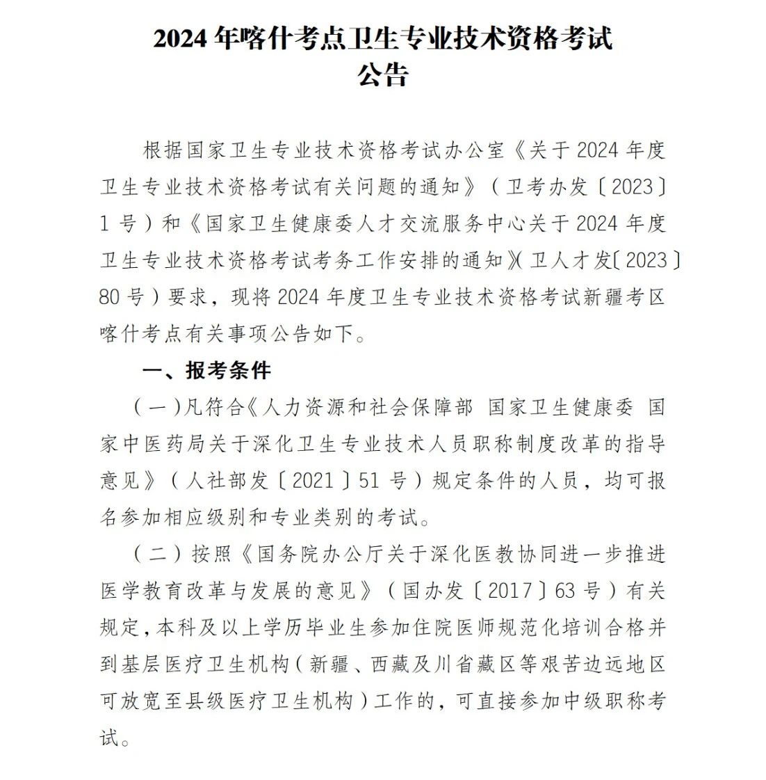 2024年喀什考點(diǎn)衛(wèi)生專業(yè)技術(shù)資格考試公告