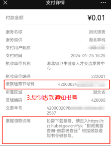 2.點擊非稅支付收款通知信息,進入【支付詳情】頁面,復(fù)制【繳款通知書號碼】,在瀏覽器中打開【票據(jù)領(lǐng)取說明】中的地址:https://czt.hubei.gov.cn/fsjk