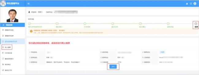 2.點(diǎn)擊左側(cè)【網(wǎng)上繳費(fèi)】,核對(duì)報(bào)考專業(yè)、科目和金額,確認(rèn)無(wú)誤后點(diǎn)擊“支付”跳轉(zhuǎn)至考區(qū)指定的繳費(fèi)平臺(tái),完成繳費(fèi)。