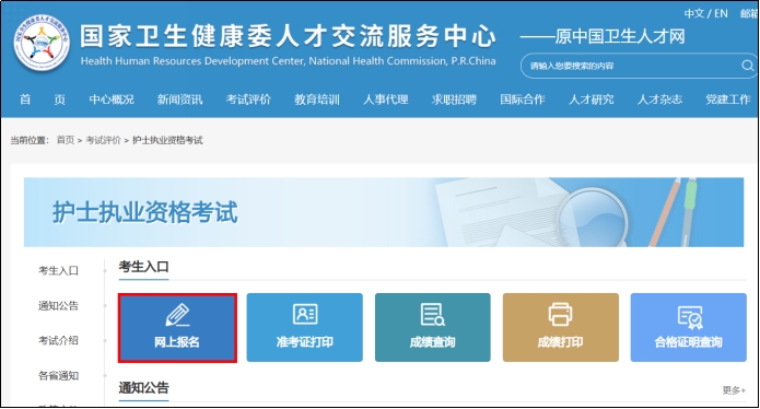 1.進(jìn)入官方網(wǎng)站“衛(wèi)生專業(yè)技術(shù)資格考試”或“護(hù)士執(zhí)業(yè)資格考試”專區(qū)(下圖為護(hù)士執(zhí)業(yè)資格考試專區(qū)),點擊“網(wǎng)上報名”。