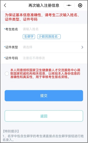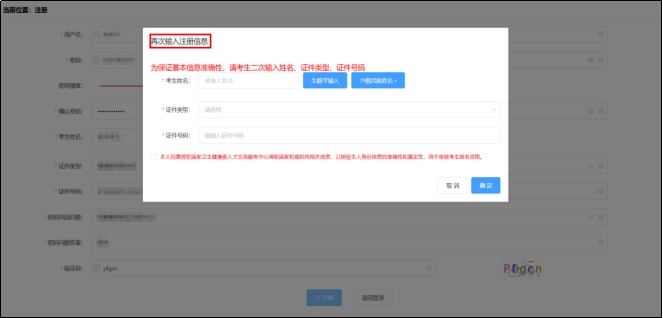 點擊“提交”后,為了確保注冊信息的準(zhǔn)確性,需考生二次輸入姓名、證件類型、證件號碼。