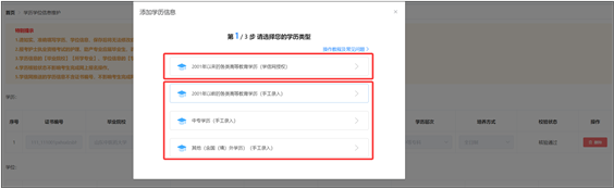 2.中專學(xué)歷、2001年以前的各類高等教育學(xué)歷和其他學(xué)歷需手工錄入;