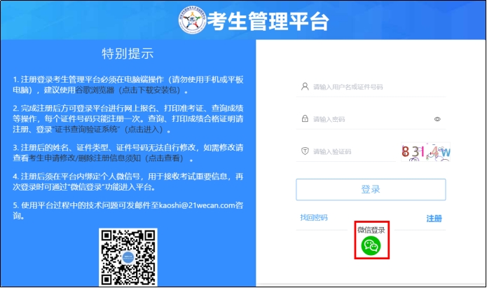 考生微信綁定成功后,可以在考生管理平臺登錄頁面點擊