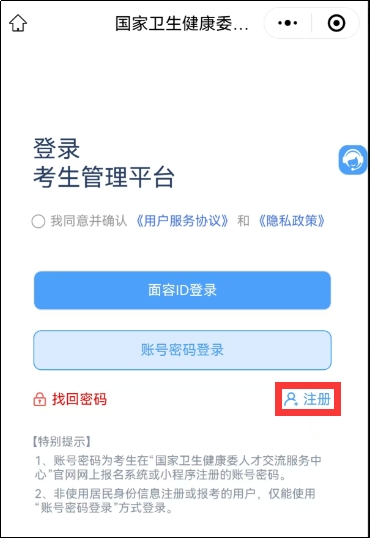 1.打開百度、微信客戶端,搜索“國家衛(wèi)生健康委人才交流服務(wù)中心”小程序,進(jìn)入考生管理平臺登錄界面,點擊“注冊”。