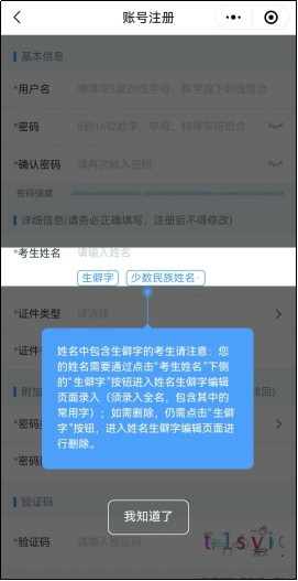 填寫姓名時,如包含生僻字,請點擊“生僻字輸入”按鈕,從列表中選擇對應(yīng)的生僻字;如姓名中包含“·”,請點擊“少數(shù)民族姓名·”。如在列表中未找到所需生僻字,請使用拼音代替。