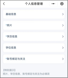 按照頁面提示上傳基本照片、維護(hù)學(xué)歷學(xué)位信息和綁定微信操作。