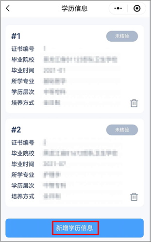 點擊“新增學(xué)歷信息”按鈕添加學(xué)歷和學(xué)位信息。