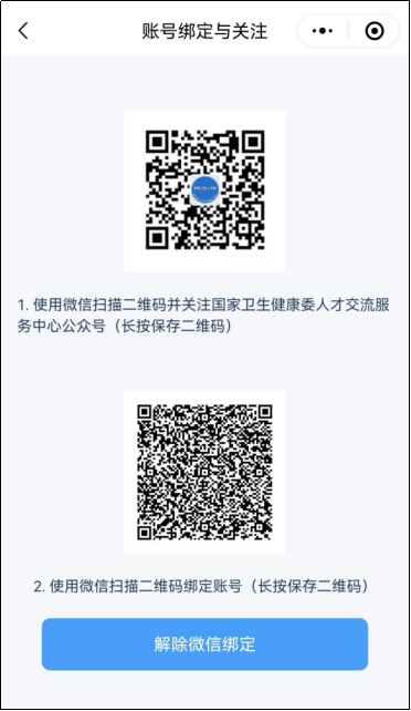 考生正式報名前,須關(guān)注“中國衛(wèi)生人才網(wǎng)”微信公眾號,并綁定微信。點擊左側(cè)導(dǎo)航菜單中“微信綁定與關(guān)注”,使用本人微信先掃描左側(cè)二維碼關(guān)注公眾號,然后掃描右側(cè)二維碼進(jìn)行綁定操作。