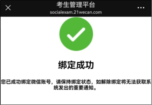 綁定成功后微信會反饋“綁定成功”提示,考生即完成注冊和基本信息填報。