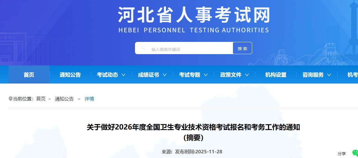 河北關(guān)于做好2026年度全國(guó)衛(wèi)生專業(yè)技術(shù)資格考試報(bào)名和考務(wù)工作的通知(摘要)