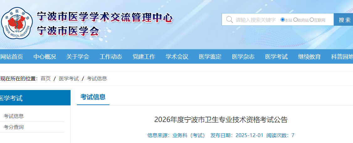 2026年度寧波市衛(wèi)生專業(yè)技術(shù)資格考試公告