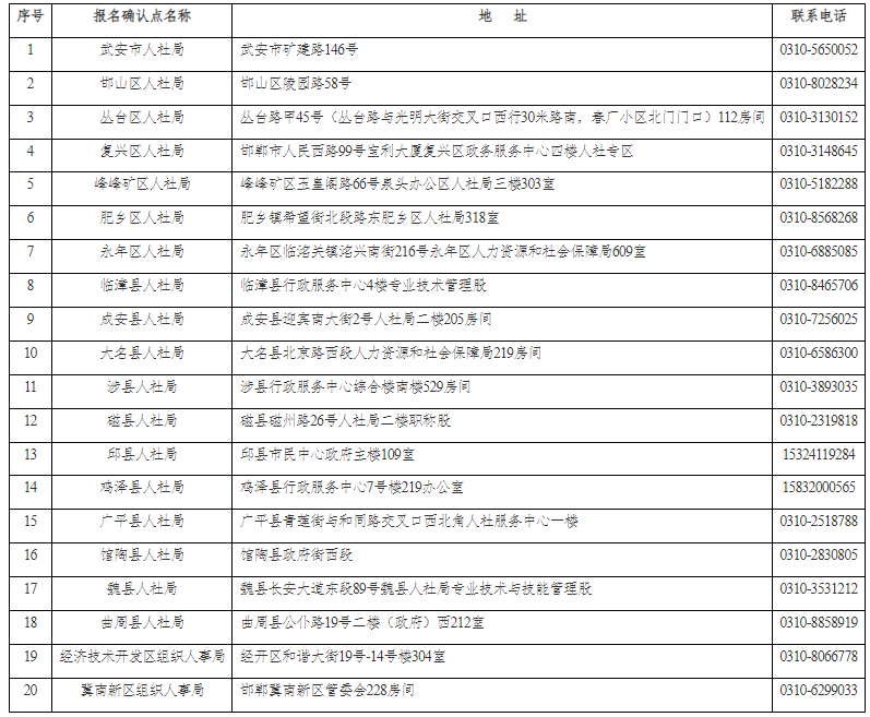 各報名確認(rèn)點的詳細(xì)地址見附件6或報名系統(tǒng)內(nèi)、河北省人事考試網(wǎng)(http://www.hebpta.com.cn)查詢報名點地址和聯(lián)系方式。