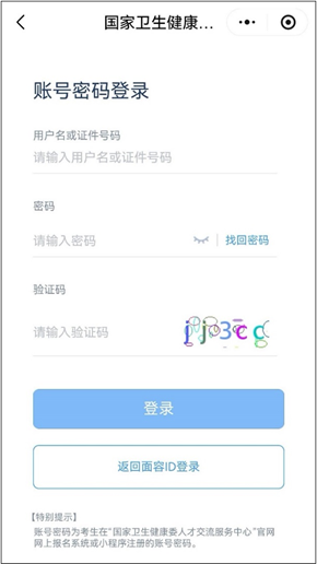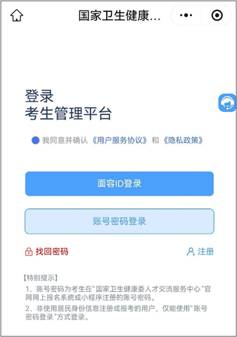 打開百度、微信或支付寶客戶端,搜索“國家衛(wèi)生健康委人才交流服務(wù)中心”小程序,進(jìn)入考生管理平臺登錄界面。